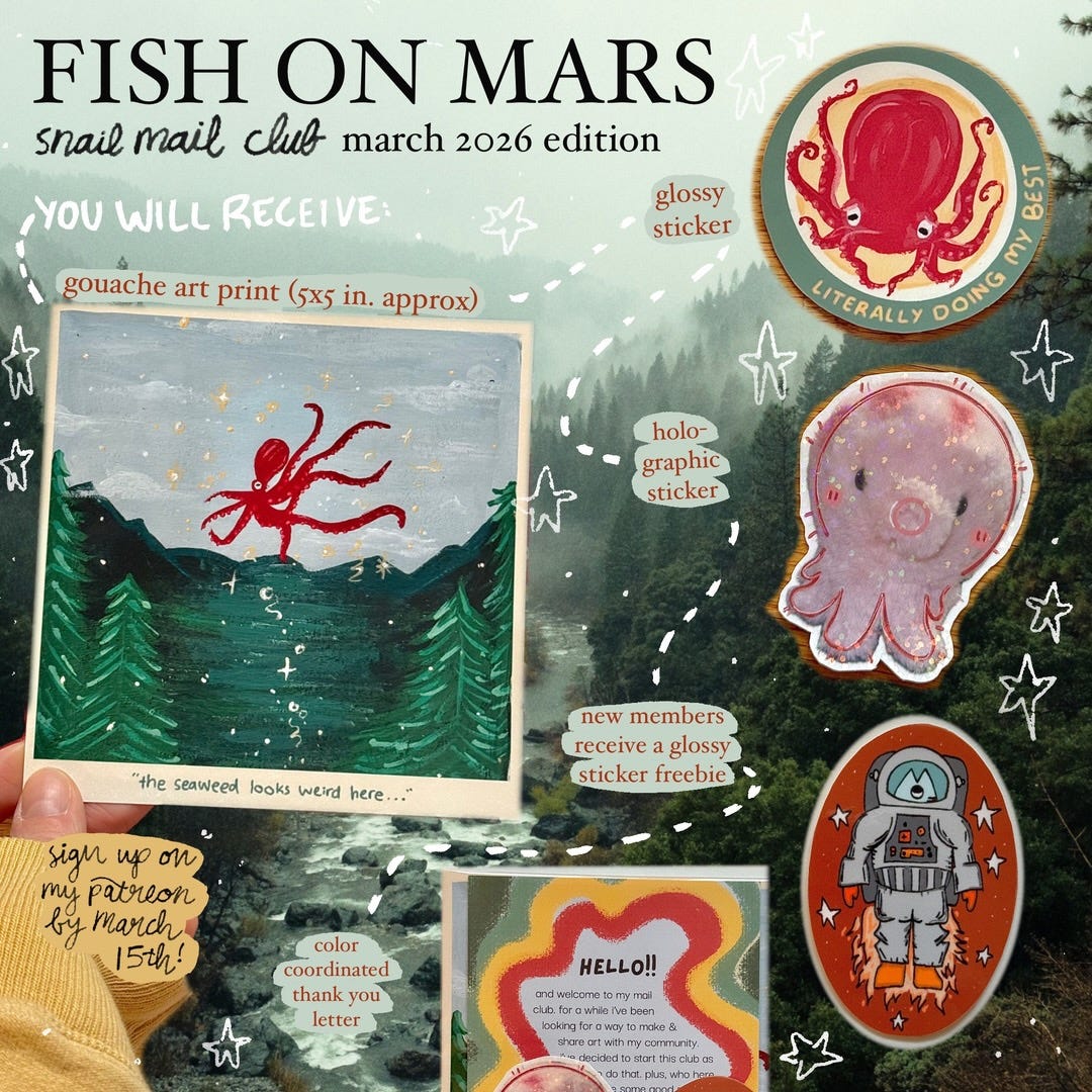 My daughter is starting a “snail mail” art club called Fish on Mars through Patreon and I highly recommend you check it out. She’s putting together a different collection of themed prints, stickers and more that will arrive in your physical mailbox monthly. For much less than a bowl from Chipotle, you can support an artist and get whimsical art delivered right to your house.