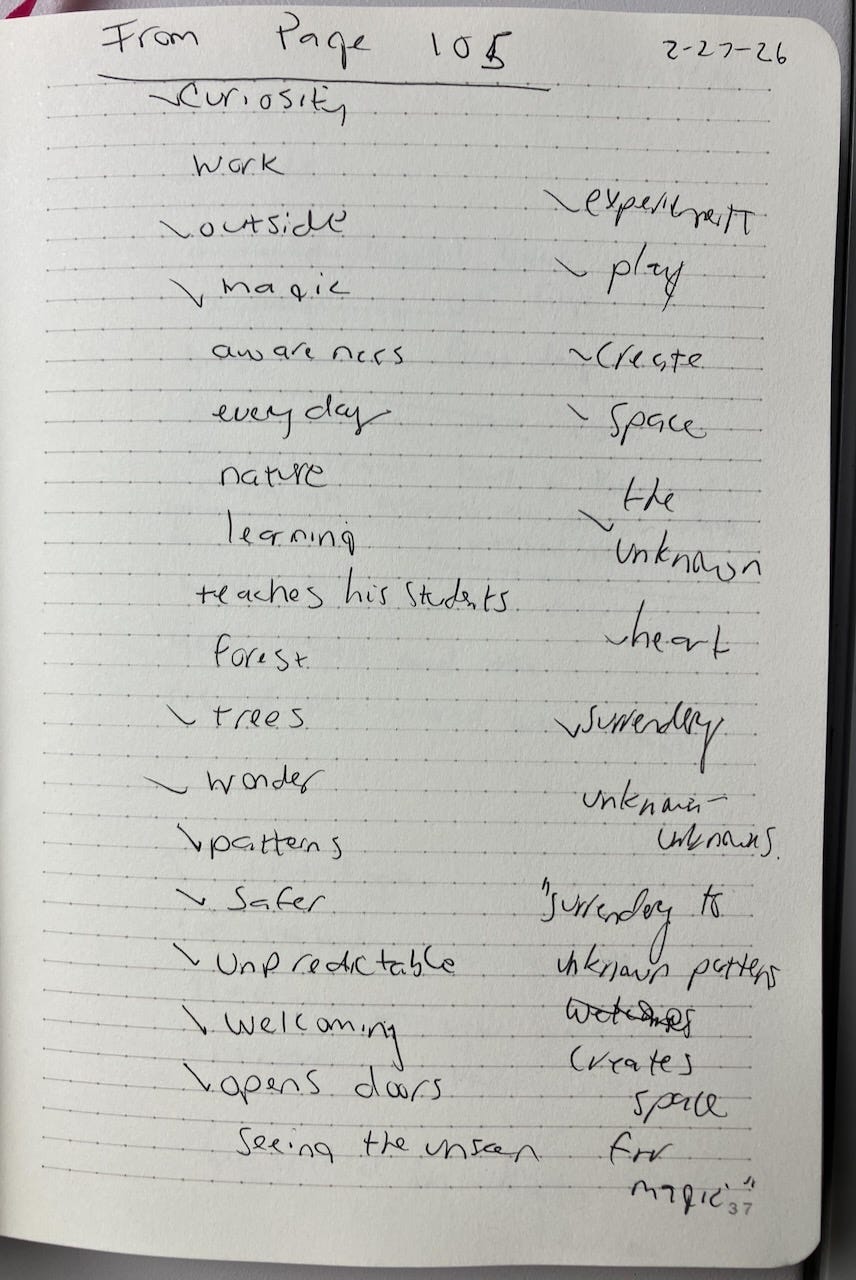 Our first prompt was centered around erasure poetry. Shannon had a stack of poetry books and she invited us to pick one and “erase” some of the words to create a new poem. For some reason my brain couldn’t unleash a new poem from within an established poem. Instead I opened The Book of Alchemy and picked a random page (page 105). I looked through the sentences, pulling words that grabbed my interest and wrote them in my journal. After I was done, I grouped them together to form something new.