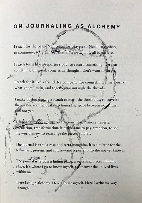 In my last post I told the story of how I accidentally started a Journaling Club. Our club is made-up of four women who meet regularly to go through the prompts in the The Book of Alchemy by Suleika Jaouad. I also wrote about our first meeting. Before I tell you about our second meeting, let’s talk about the journal itself.