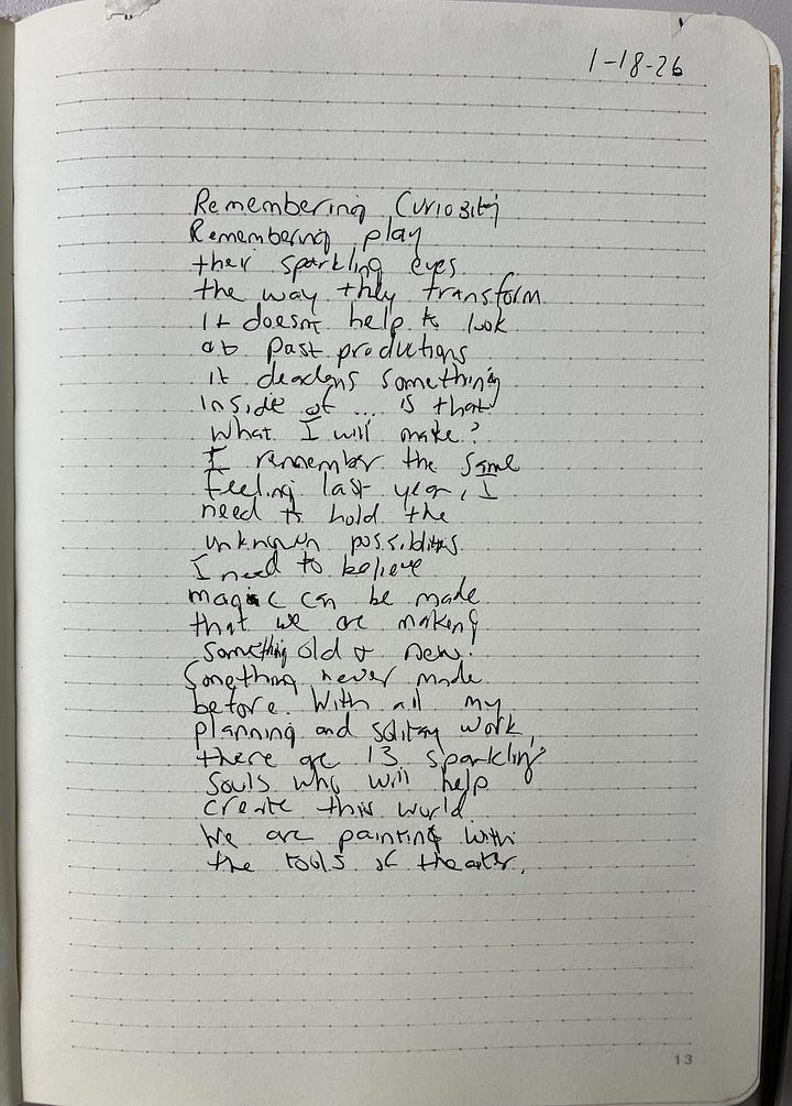 For a bit of context, I’m currently at the point in the play I’m directing where it’s time to start advertising to the outside world. It’s difficult for me to promote something that is still a lump of clay with only hints of its final shape. The sets and costumes are still being designed, I’m only halfway through staging the scenes with the students. Right now I’m trying to look into the unknown and lean into something other than fear.